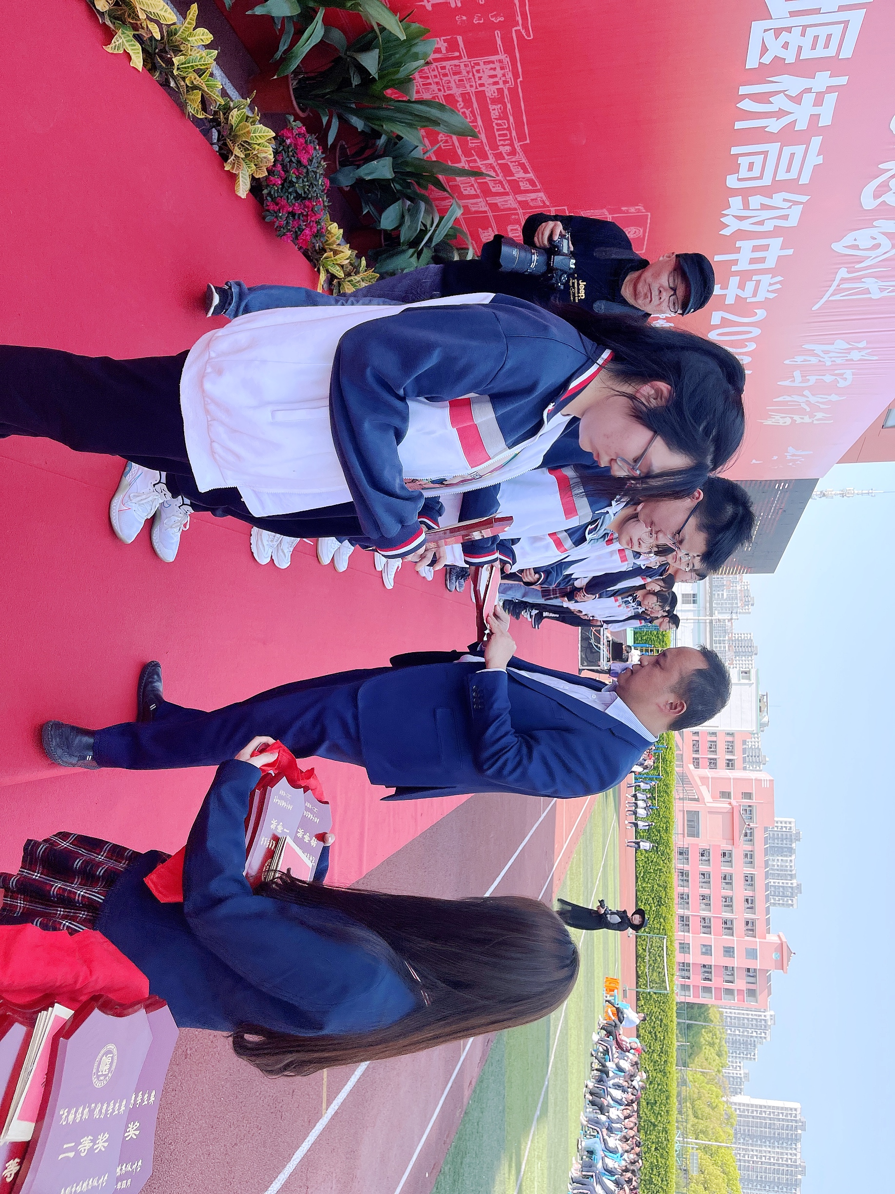 無錫市堰橋高級中學副校長陳登峰先生宣布表彰會開始,胡建秋校長致辭,并向企業家頒發獎勵基金捐贈儀式,留念牌、基金牌、鮮花。